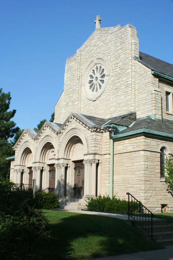 Across the street from the convent stands the Catholic church of Saints Mary and Joseph, along with its associated school building.