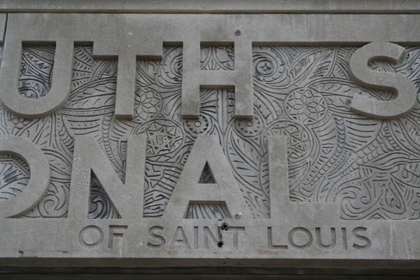 The Art Deco tower was built in 1928, from plans by the St. Louis Bank Building & Equipment Company. It is clad in grey limestone and decorated with stylized eagles and numerous geometric and floral patterns that place it among St. Louis's finest Deco buildings. Within, its grand bank lobby is still intact, right down to the ornate chandoliers.