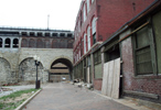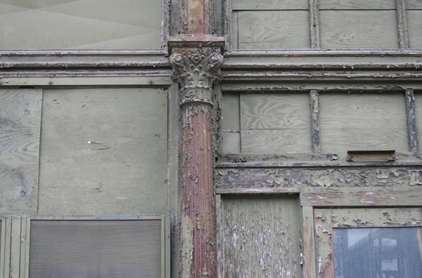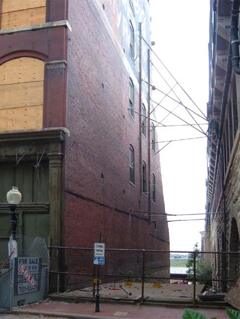 The eastern facade, long deteriorating and visibly unstable after decades of abandonment, suffered a massive collapse on July 21, 2006 in the intense storms that blew through St. Louis. Winds of over 90 mph scattered bricks and debris across a vacant lot and the adjacent Eads Bridge. Emergency scaffolding was raised to protects the bridge, while the remaining wall was shored up by struts anchored against the Eads Bridge.