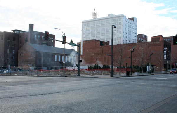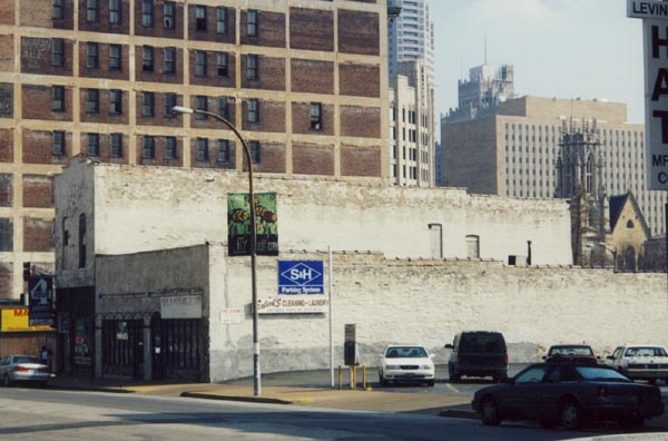 Slathered in unbecoming stucco, these two buildings were long tattered around the edges. Though home to several small businesses, they were demolished in 2007 to make way for a high-rise project called the Skyhouse. Skyhouse fell victim to the slowing economy, however, and the site remains vacant as of early 2009.