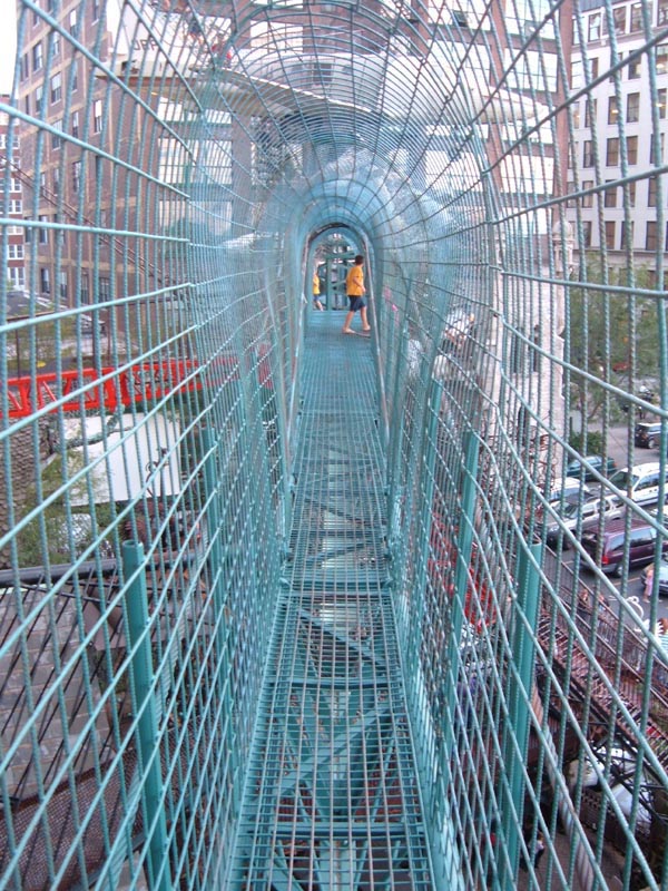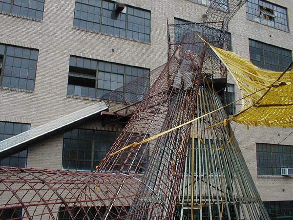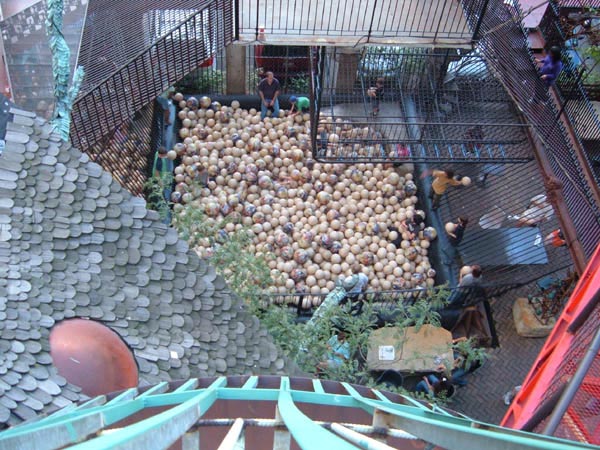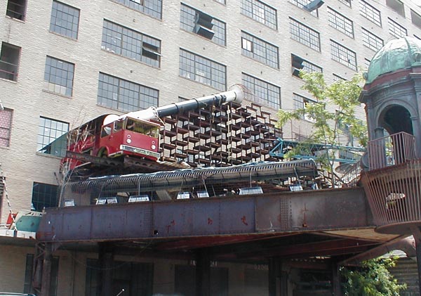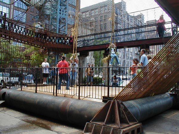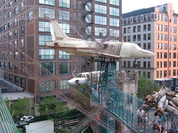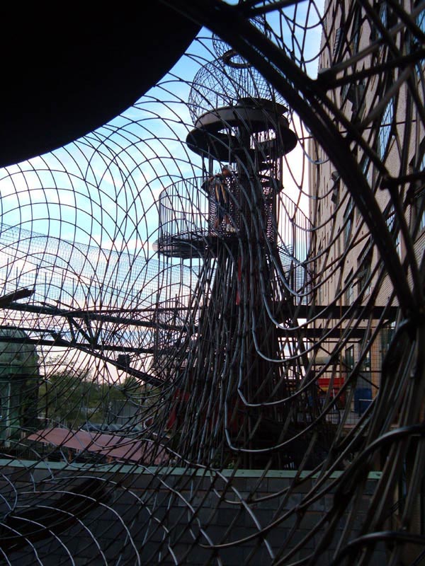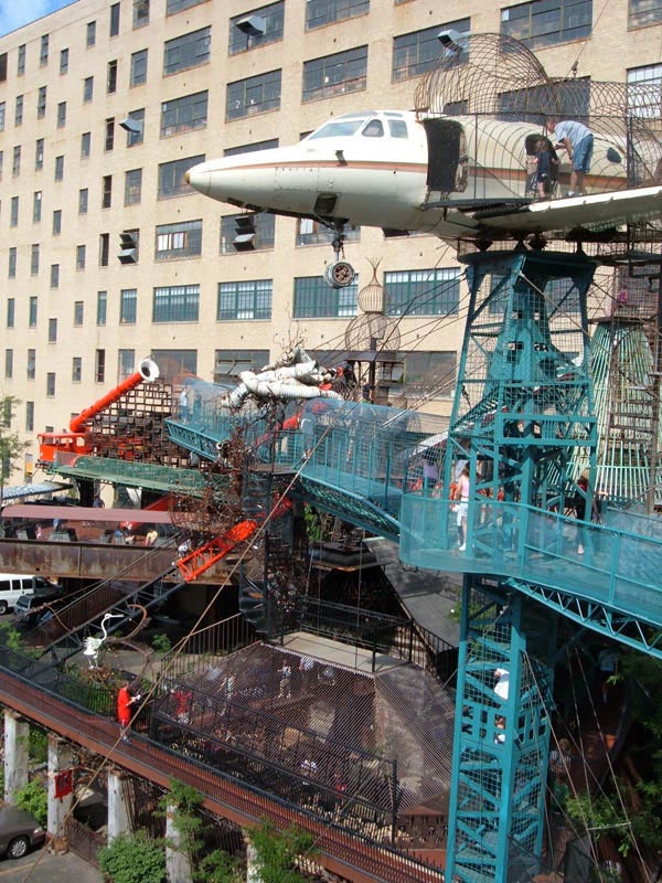 The City Museum is the product of local artist Bob Cassilly's wild imagination. It is a collection of salvaged objects: trucks, cranes, buses. Industrial gears, rollers, pins, and rods. Building fragments: columns, grotesques, cupolas, cornices, statueary. On the outside, these artefacts have been assembled into a four-story-high gymnasium known as Monstro City. Inside, the museum is only slightly more tame, with tunnels, tubes and slides writhing through multiple stories of the old warehouse.