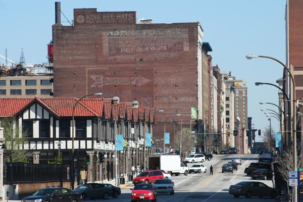 Barely visible on the building's west face are the faded remains of numerous advertising signs. Among the more legible ones are ads for Wrigley's Spearmint gum and for the building's one-time tenant, King Bee Hats.