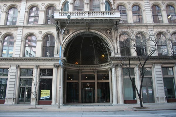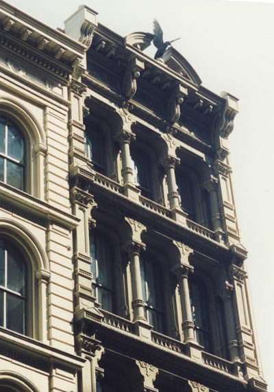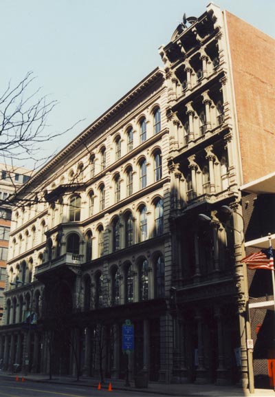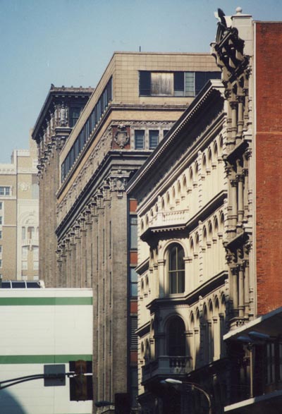These two facades cover one building behind; the two structures were elaborately joined together in 1898, at which time 555 gained its magnificent recessed entryway. The facade at 511 is one of only two curtain-wall cast iron facades left in the city.