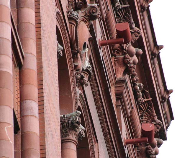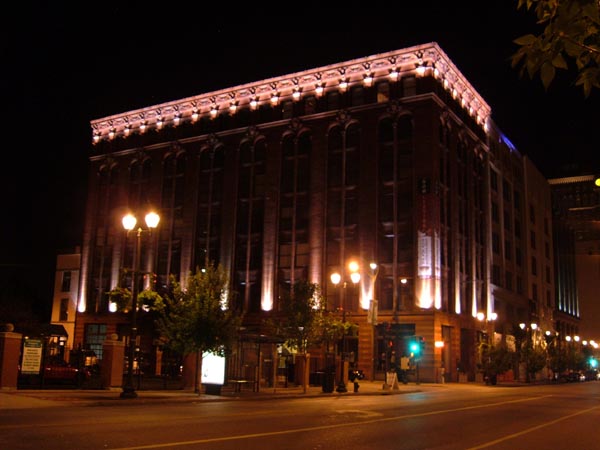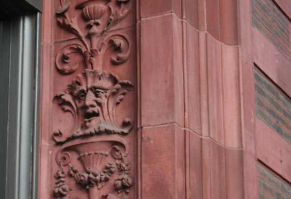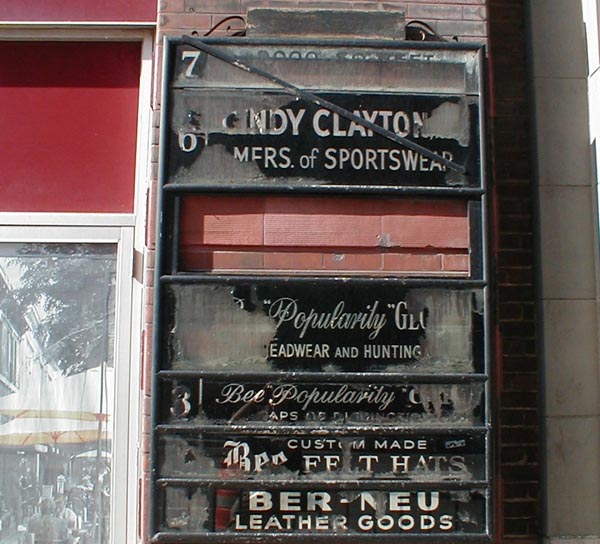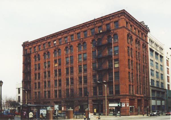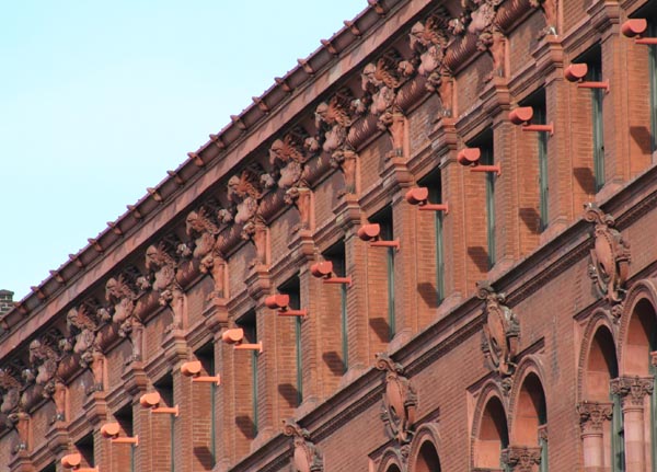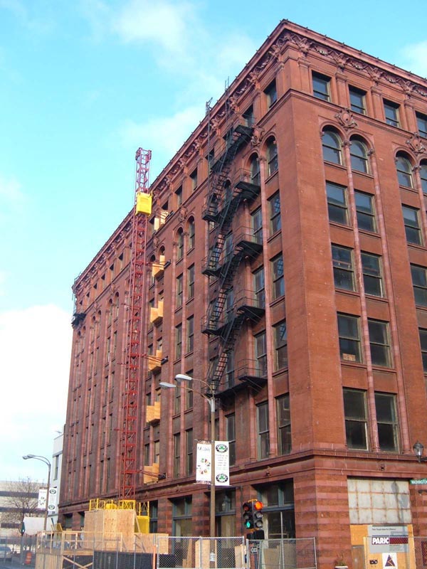 Originally constructed for a real estate company, 1021 housed at least two different shoe companies in its early decades. The Bee Hat Company moved in in 1944, using the building for warehousing and sales2. In 2000 they moved out. Remediation and renovation began in 2005, converting the building to residential units with two retail spaces on the street. The renovation also included night lighting of the building's cornice, and the return of a pipe system that blows steam out of the mouths of the second-story decorative lion heads.