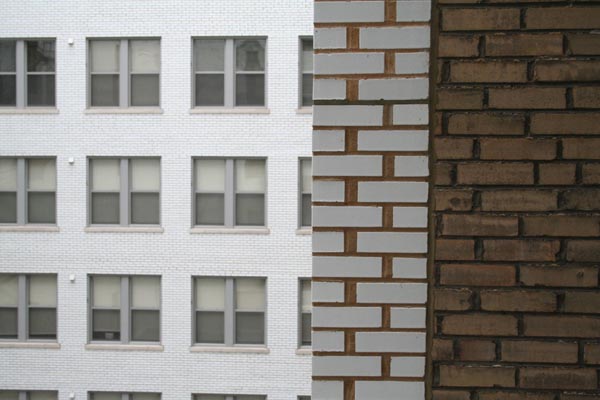 There, we passed massive, ancient, rusting boilers; a room piled high with bricks from the Wright Building's temporarily de-constructed parapet walls; and several dark, narrow rooms lit only by the cloverleaf openings cut into the stone panels below the building's cornice.