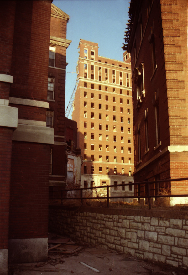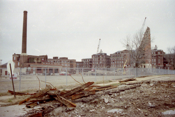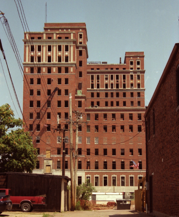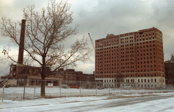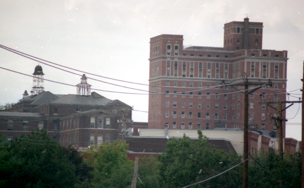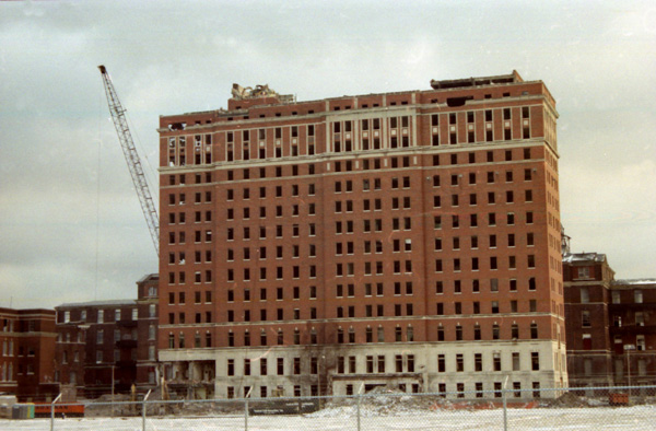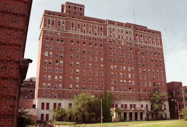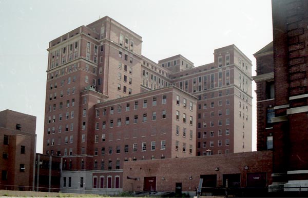 The Tower was a 14-story structure erected to help modernize and expand the City Hospital complex. Its massive bulk visually dominated the site for six decades. It stood back-to-back with the Main building, its flat northern facade belying the complicated, multi-section, multi-roof design.