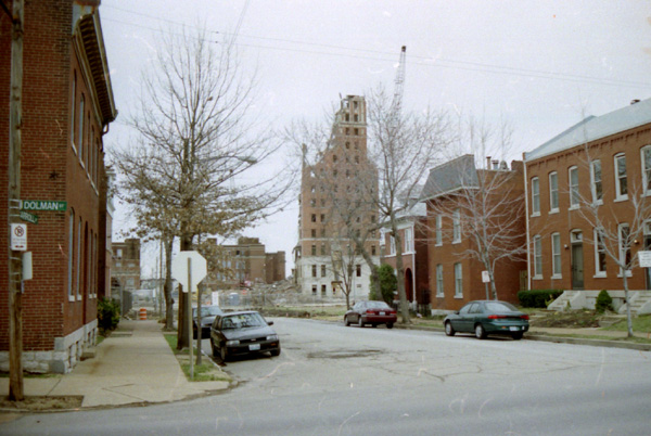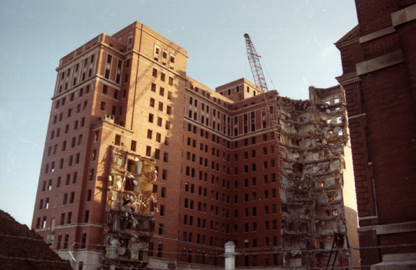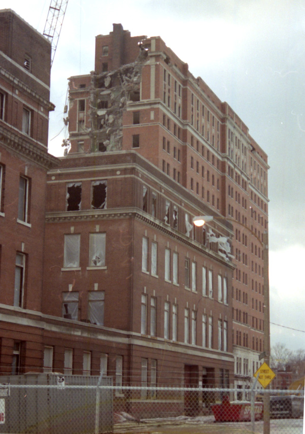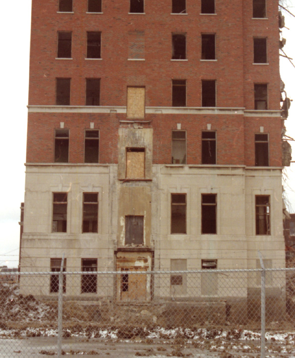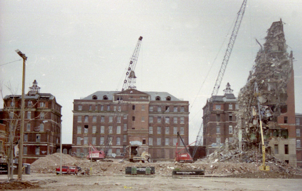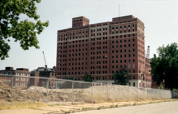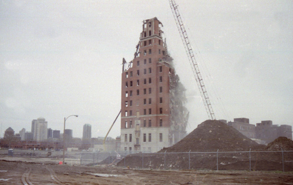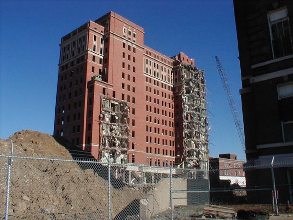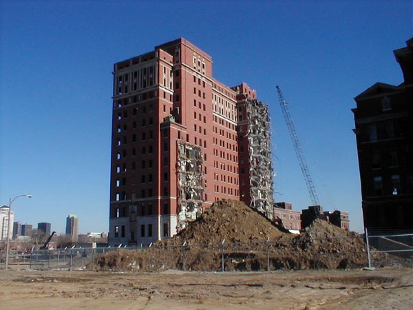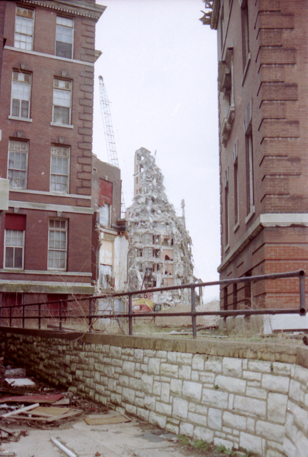 Long a point of controversy among preservationists and developers, the Tower Building was often seen as clashing in scale with most of the complex and - since the neighboring Darste-Webbe housing towers have been destroyed - the surrounding neighborhood as well. Most renovation plans dismissed it as unworkable outside of an institutional context. Demolition began on the building in December 2002 and was completed by spring of 2003.