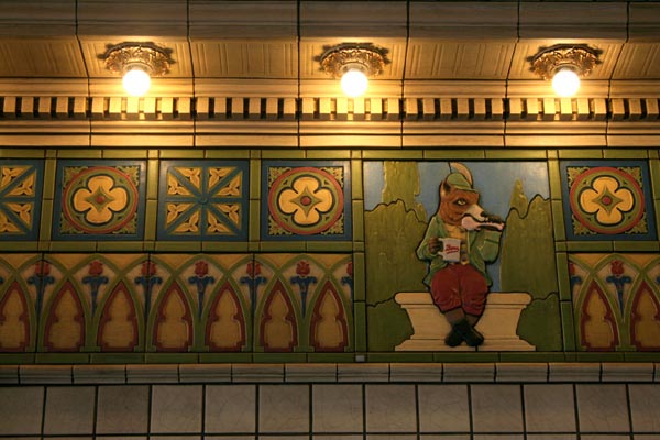 The corners and interior atrium feature images of "Renard the Fox", a European folklore character that was adapted as the mascot of the new brand. He is eternally gnawing on a chicken leg and hoisting a mug of "Bevo the Beverage", as it was marketed.