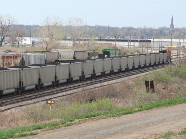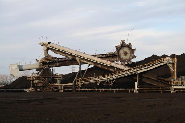 The operation shown here is a coal transfer point. Coal trains arrive from coalfields (likely in central Illinois), back into the building shown here one car at a time, and are unloaded. The coal is transfered by the massive bucket wheel excavator.