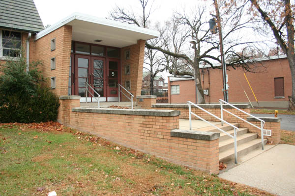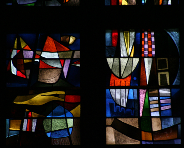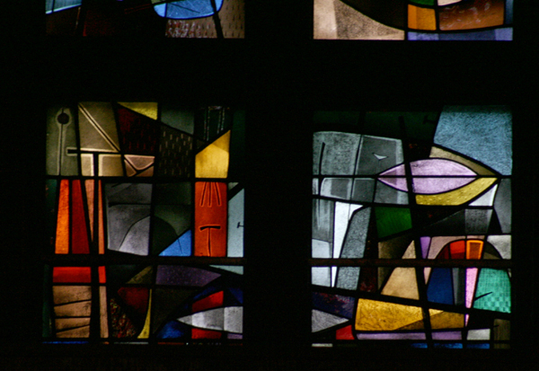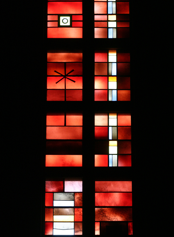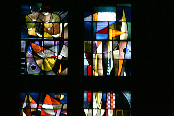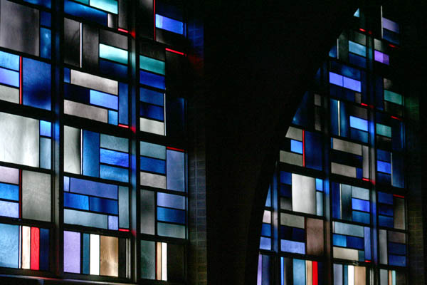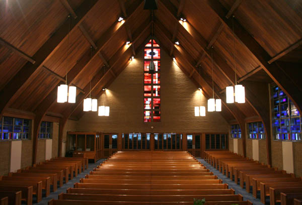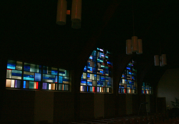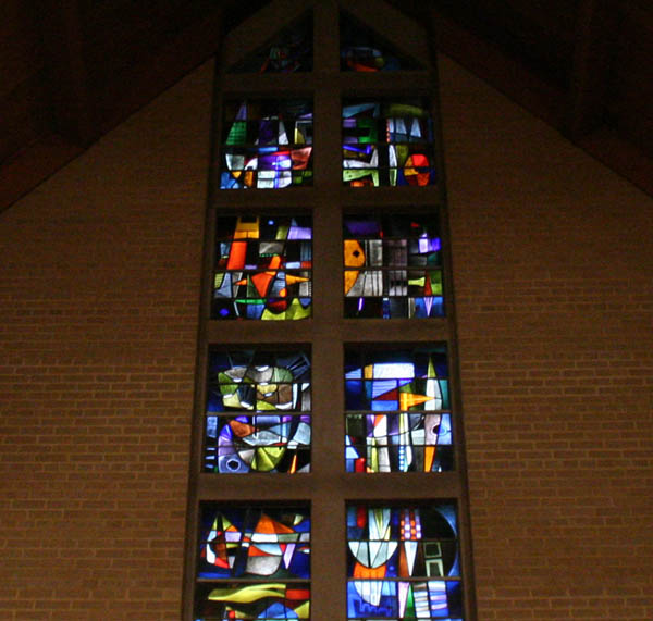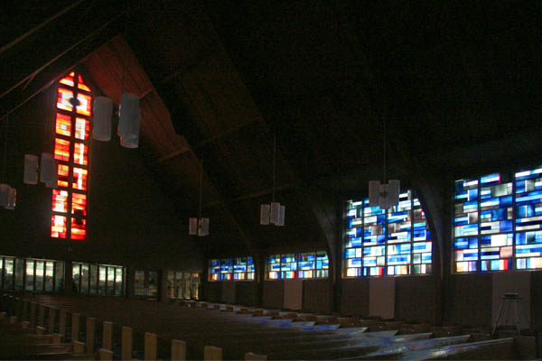 A small, simple A-frame design, not far from Wash U's campus. The interior is wood-framed simplicity, with large expanses of colored panes. In the windows behind the pulpit, a flurry of abstract designs erupt in a tall, narrow strip of vertical windows.