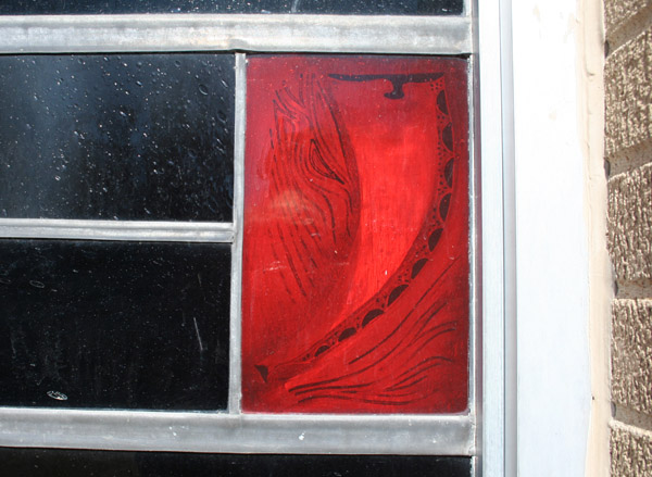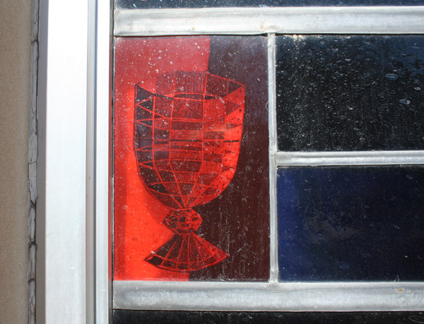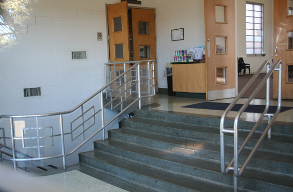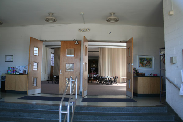 Exterior stained glass is minimal, consisting of a few random colored panels with etched designs, set in a wall of clear glass at the south side entrance. The interior is spare and sparsely decorated. The lobby uses the same stainless steel railings as the exterior steps.