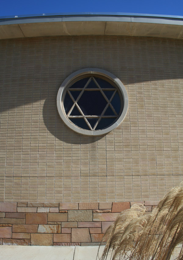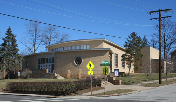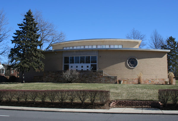 Only blocks away from Shaare-Zedek, this shul is similarly Modern and uses the same vocabulary of blonde brick. Set among the Tudor and New England style houses on these suburban streets, its eruption of overlapping pure geometric forms is a shocking contrast with its suburban surroundings.