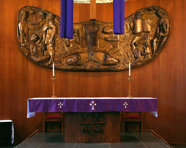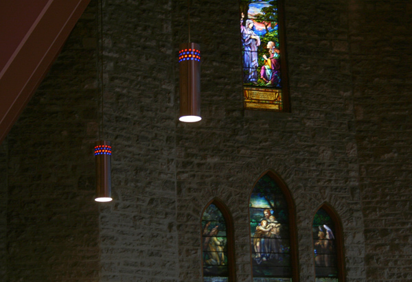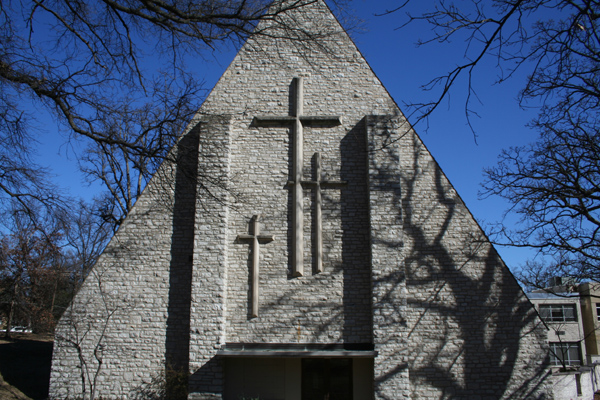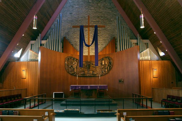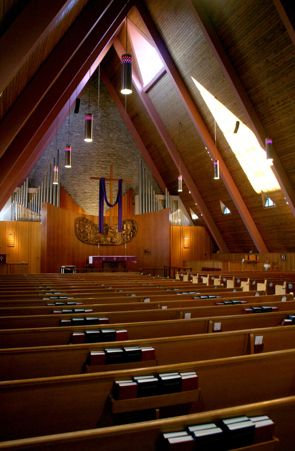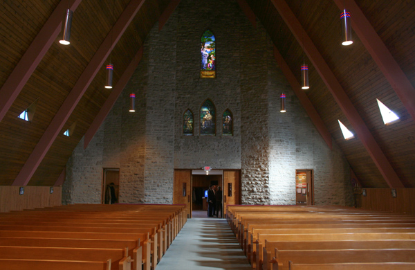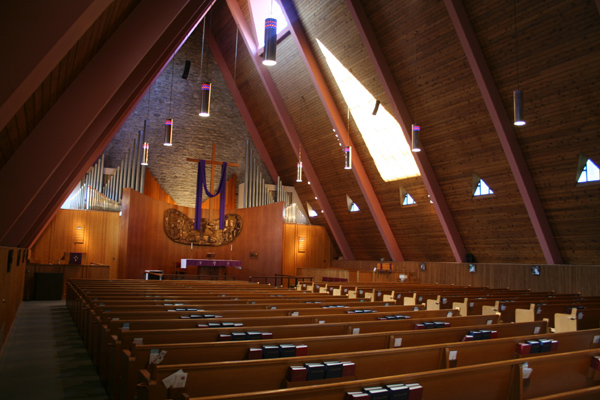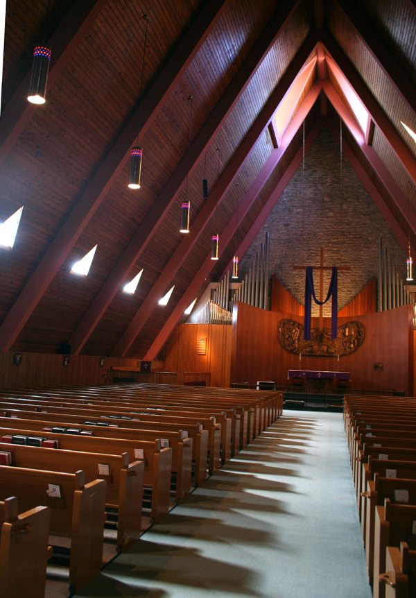 A lovely A-framed church by the same architect who did St. Mark's Episcopal 25 years earlier. Inside and out, its rough-faced stone end walls give the impression of being carved rather than built; two attached buttresses also give it the look of being a fragmentary ruin of a much larger church. Wood laminate beams support the roof, forming a dramatic sanctuary.