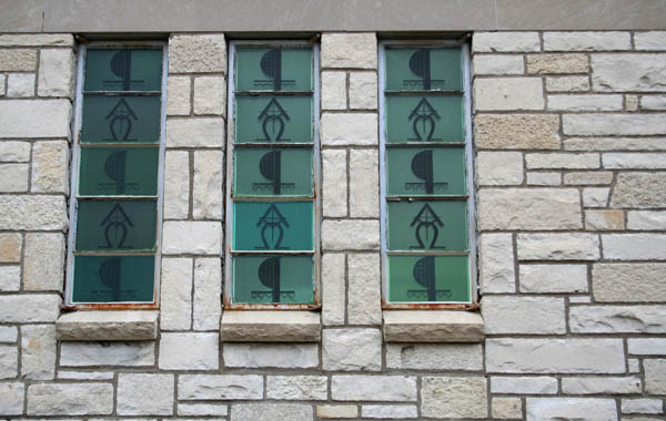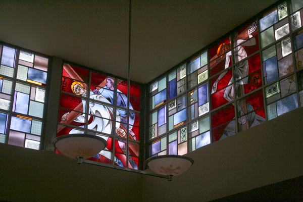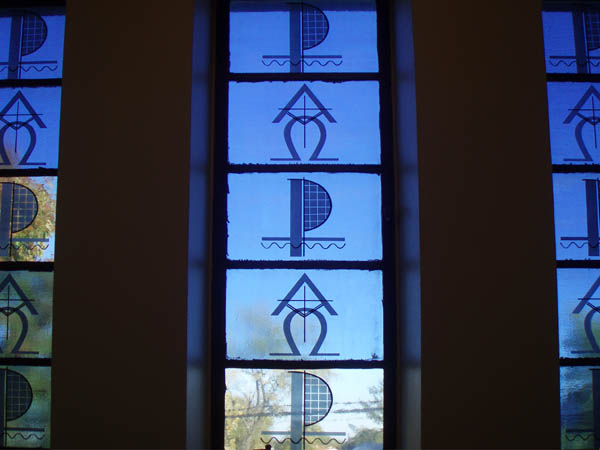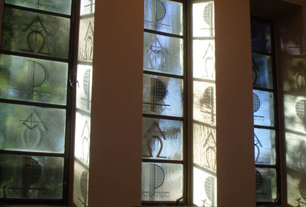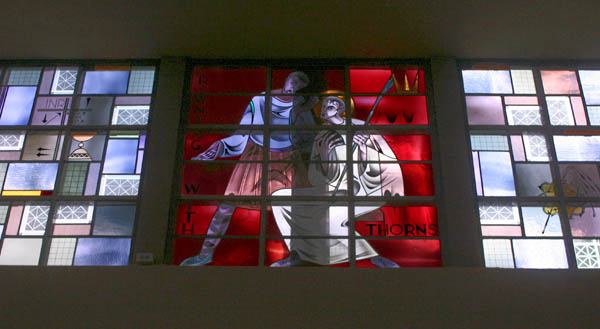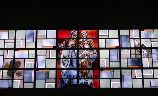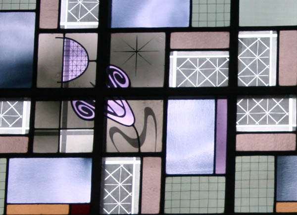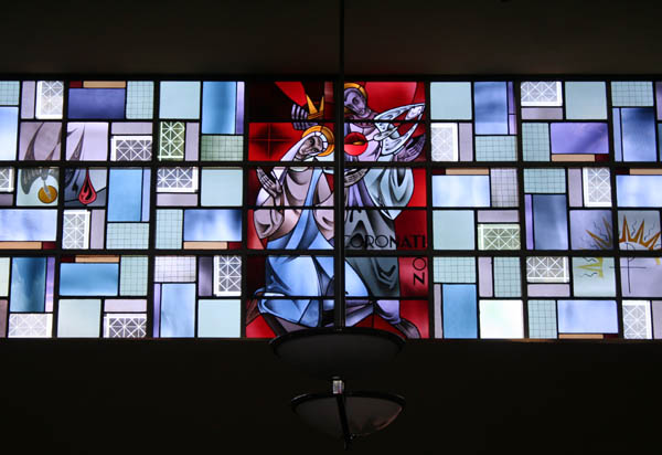 Key scenes from the life of Christ appear at regular intervals on the clerestory windows, their rich red background setting them apart from the coolly colored geometric background of colored fields and biblical symbols. The grid patterns appear unique to this installation.