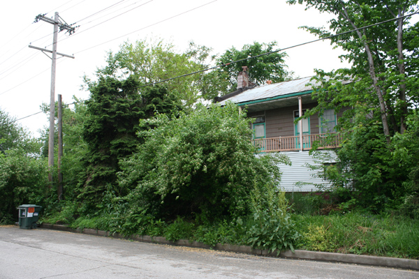 Adorned with a severely 1960s faux-mansard skirt of asphalt shingles, this former home stands at Broadway and Gano and is now home to Roberts Inc. heating and AC.