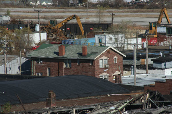 E. Holly Avenue shows the total transformation of this neighborhood. Two ragged frame houses survive, the former in industrial service, the later fire-damaged and abandoned. All the lots between them have been consumed by a single giant warehouse building.