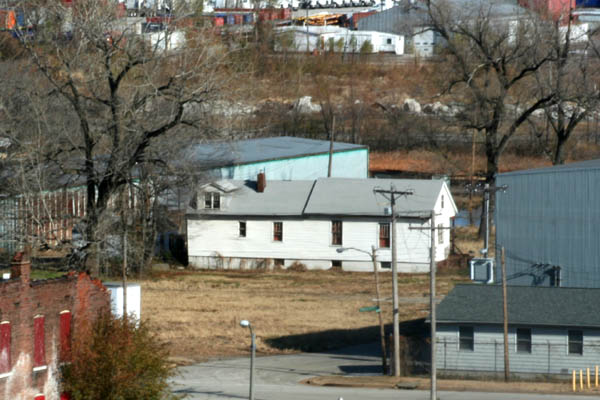 On the same block, almost back-to-back with the white house above, a stock red brick 2-story stands abandoned, facing N. Broadway and the highway embankment.