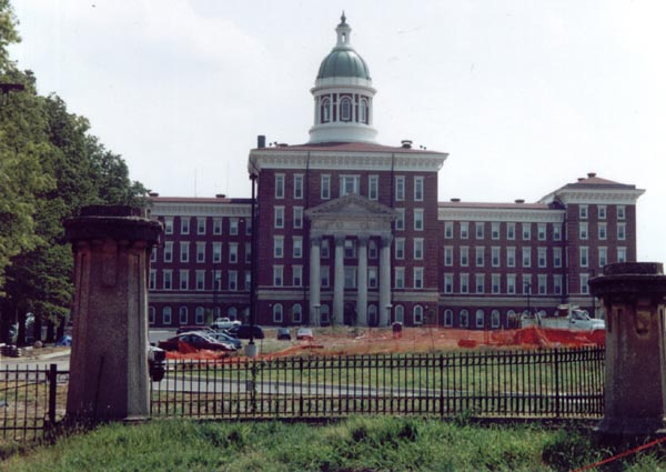 (Don't bother trying to go through the main gate. The security guys don't much like photographers, and as the building is a state-owned care facility, casual visitors aren't allowed. A shame, too, since the guard shack sits directly in line with the main building's centerline -- meaning that, after all this time, you still can't get a centered photograph of the building's front elevation.)