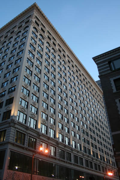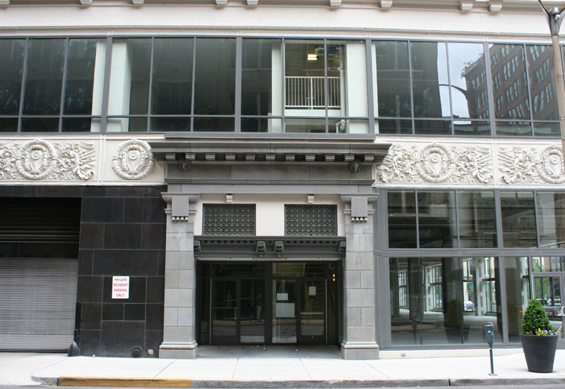April 2010 - Restored entryway on the northern side. A similar entry greets tenants on the south side. Note the columns visible behind glass. For years the second-story windows had been blacked out, removing the columns from sight and leaving a madly inappropriate continuous ribbon window at the second story, which was completely unable to bear the visual weight of the building's twelve stories. The clear glass restores this long-missing element from the building's architectural composition.