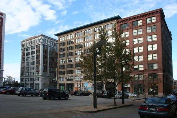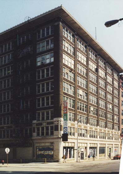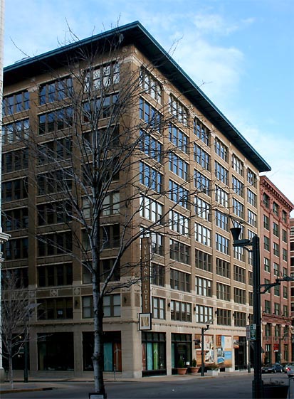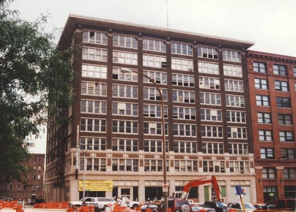 Clear influence of the Wainright Building is visible here: strong vertical piers capped with a flattened cornice. Large expanses of glass mark it as a modern building in its day.