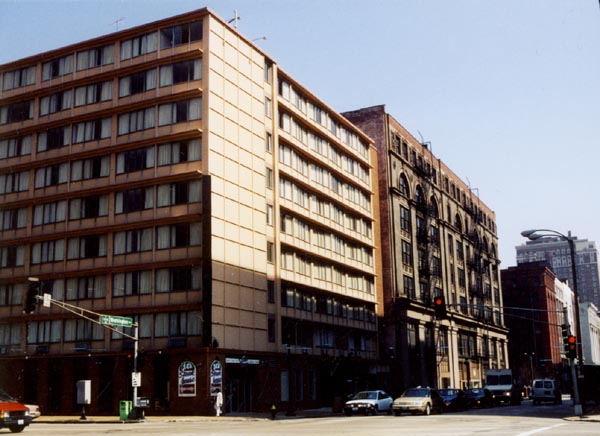 1133 Washington is a random injection of MidCentury Modern into the otherwise pre-War stylings of the Avenue. The checkerboard of color on its opaque facade was long-gone, leaving its Jetsons-space-age architecture appearing rather tepid. It was not aging well by the time the last occupant, a Days Inn, closed its doors circa 2000.
