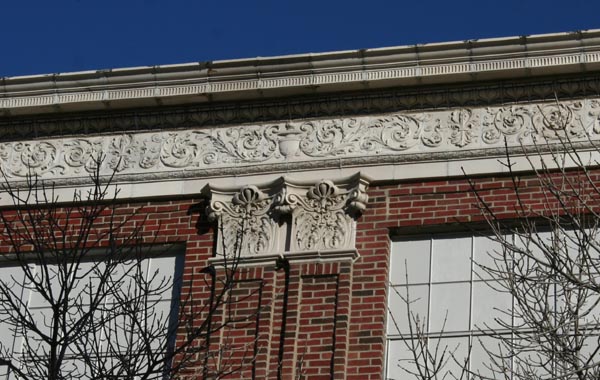 Standing alone on its block, this tall, thin building is more fussy than the other Romanesque buildings in the area, with engaged columns and pilasters. It bears faded ghost signs on both party walls, enumerating some of its previous tenants. Among the more prominent: