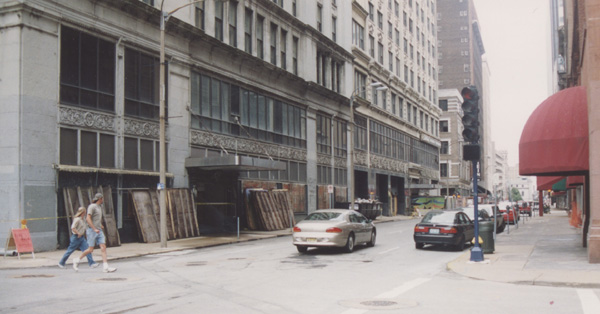 Developer Mark Finney bought the buildings at auction for $600,000 in 1993, originally intending to redevelop them. The buildings were emptied and gutted... then renovation halted. Years of legal wrangling ensued as Finney attempted to demolish the buildings for a parking lot, and the city blocked the attempts. Meanwhile, the buildings sat vacant, deteriorating and surrounded by a chainlink fence which blocked the sidewalks and streets around them.