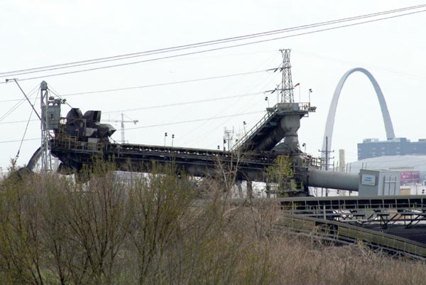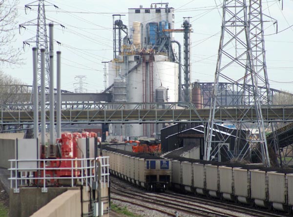 The operation shown here is a coal transfer point. Coal trains arrive from coalfields (likely in central Illinois), back into the building shown here one car at a time, and are unloaded. The coal is transfered by the massive bucket wheel excavator.