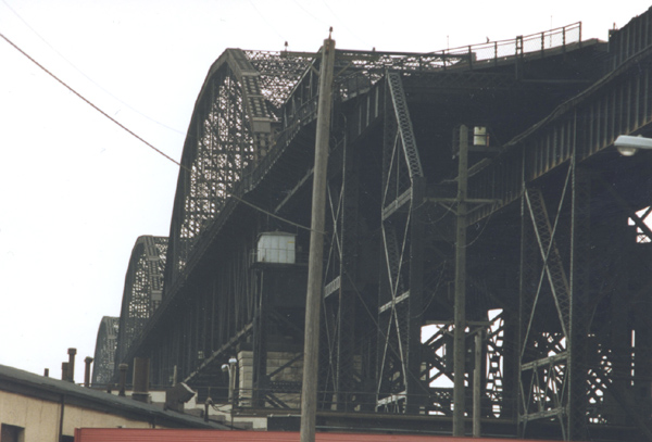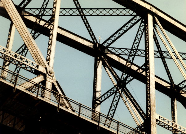 The MacArthur's enormous steel trusses and stone piers form a presence that is astonishing to stand beneath, the most powerful and awe-inspiring of the city's bridges. Though not graceful, it commands respect through its sheer size and height (equivalent to a fourteen story building.) It is the product of an age that believed in the promise of infinately bigger and more powerful machines. Appropiately, lumbering freight trains still run regularly on its lower deck today. The bridge seems strangely detached from the life of the city around it; even the space beneath it - one of the most humbling in the city - is little more than a hobo camp and fisherman's site at the south end of the Arch grounds.
