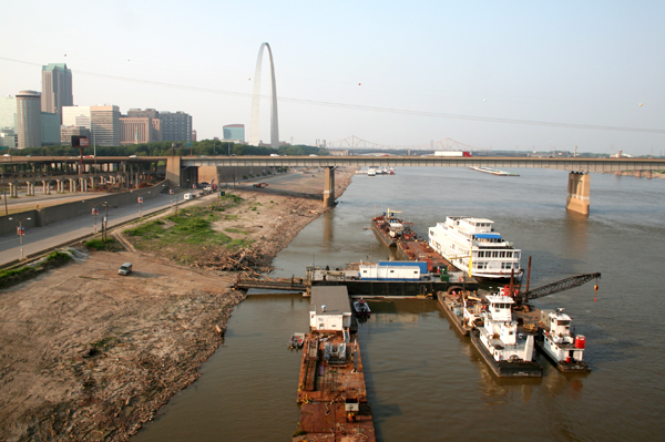 Floating equipment south of the Arch, September 2008. Notice the height of the river against the Poplar Street Bridge piers in the background... and the van at left for scale.