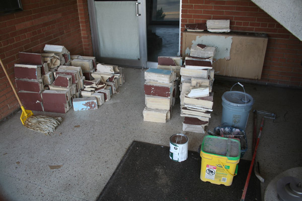 Tile and brick salvaged from the demolition have been stored for re-use in recladding the rear wall.