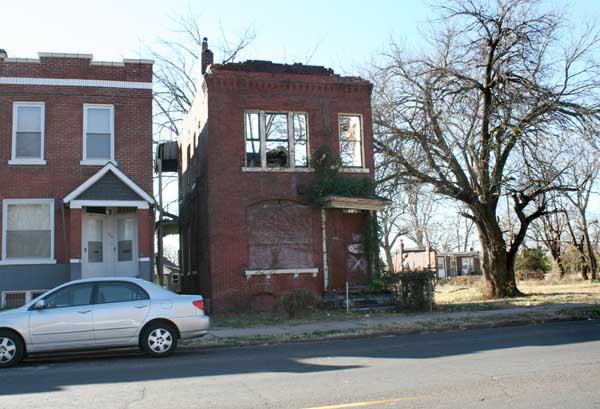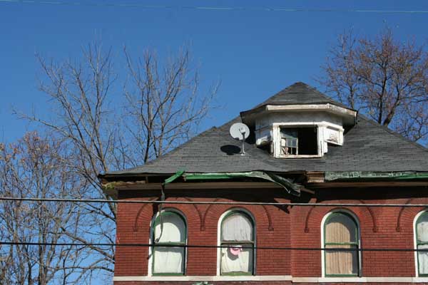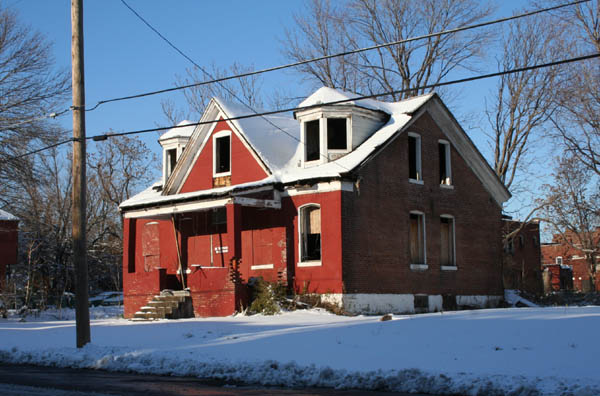 A deteriorated porch column gave way some time between 2008 and 2010, bringing down the whole front porch and the front gable of this red brick house.