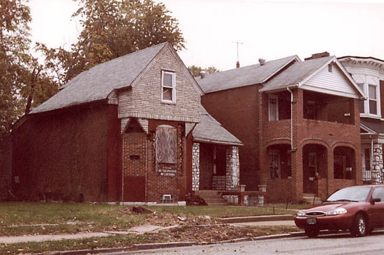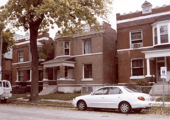 I returned in October 2002 to find that 1254 Euclid was still standing. The damaged porch columns had been patched up, the porch roof itself was no longer decaying, the crumbling cornice was repaired, the boards were gone from the front doors, and the house was being lived in again.