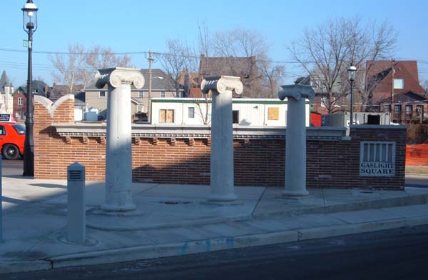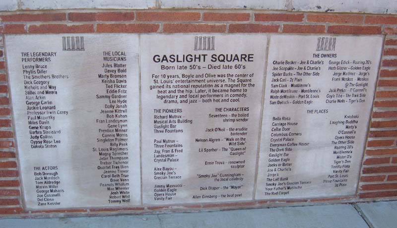 As for the original Gaslight Square, it is memorialized at the intersection that was once its heart. A stone tablet lists performers, venues, and personalities, adjacent to some of the building ornaments salvaged from the last surviving buildings. It is a sad sight on the one hand; on the other, it was clear that the Square was never coming back. The urban and social conditions that brought it about have long vanished. It was a spontaneous occurrance; no amount of planning could reproduce it. Better to have an honest memorial than some kind of weak attempt at replication.
