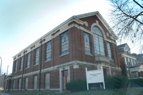 Grace Fellowship Church, 4276 Athlone Avenue at Carter, is Classical in form and details, but the opalescent stained glass shows the influence of contemporary stained glass styles.