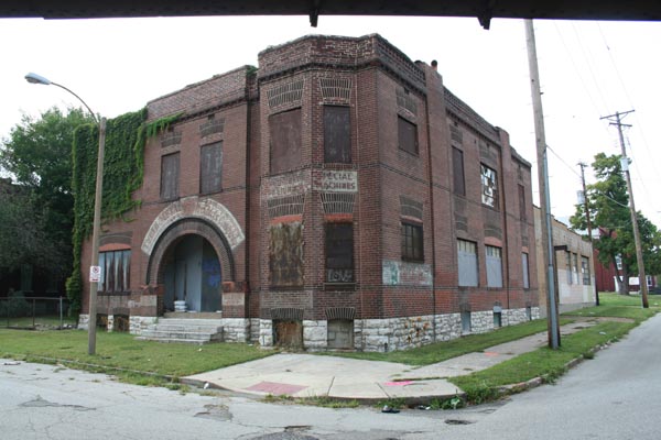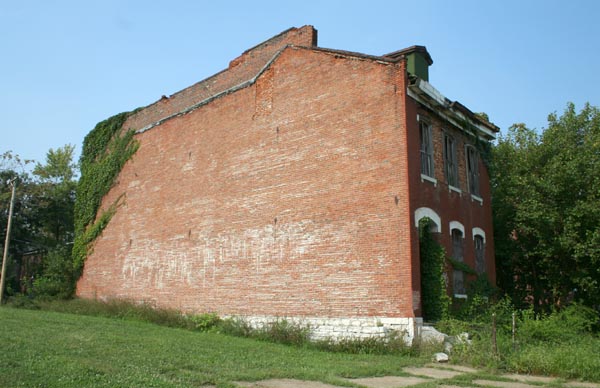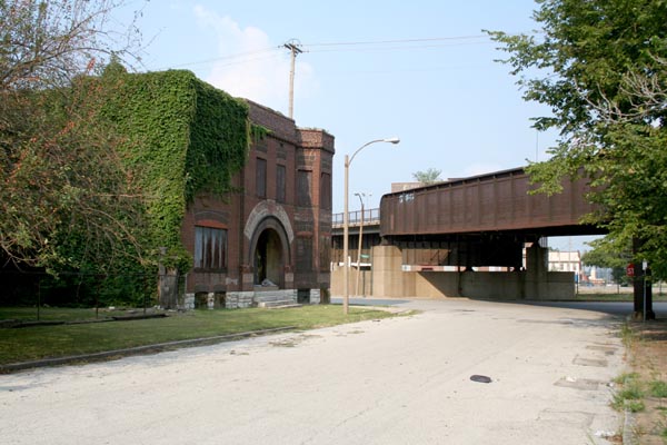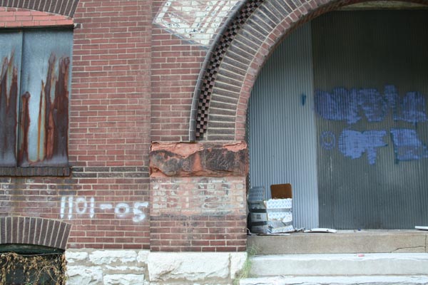 | August 2008: The block's greatest gem is this massive Romanesque building, last used as a tool and die shop. It sits almost underneath a former elevated Terminal Railroad line, which eventually leads to the McKinley Bridge. That line is now slated to become a bike path, putting this lovely old building in a perfect spot for rehab.