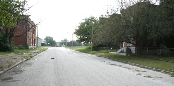 August 2008: A brave and lonely holdout still stands at 1111 Tyler. An abandoned next-door neighbor sits some distance back from the street.