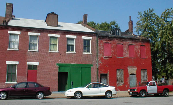 September 2006: New windows and storefront repairs dress up the house from the previous photo. But the abandoned building continues to deteriorate.
