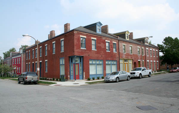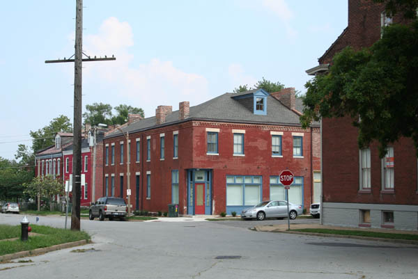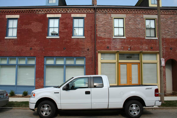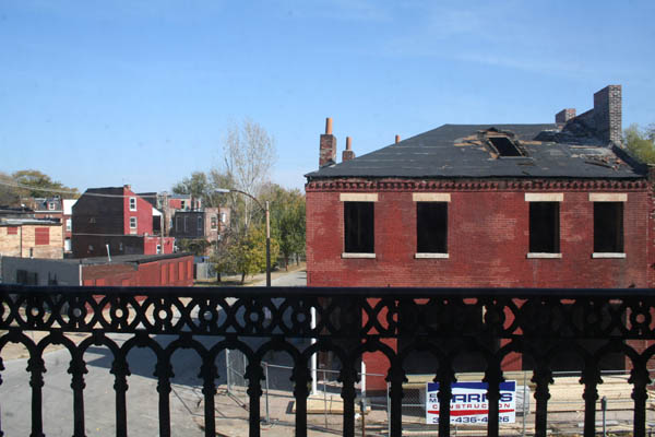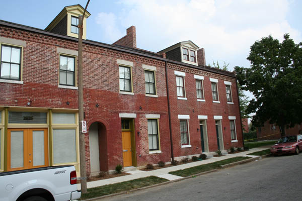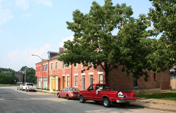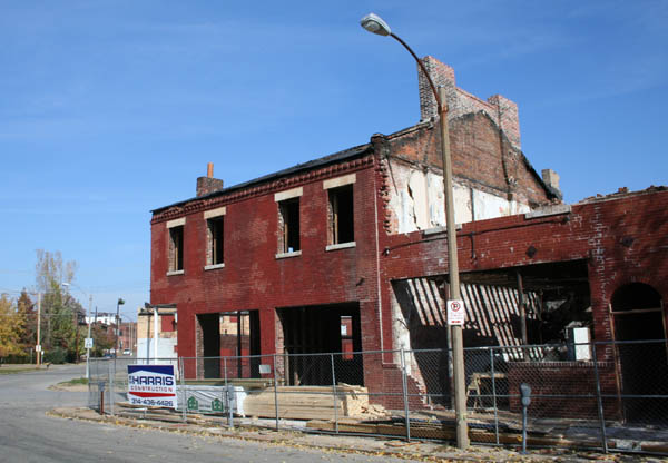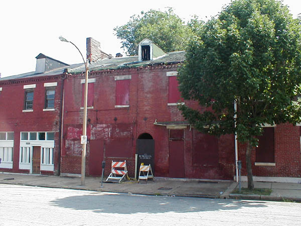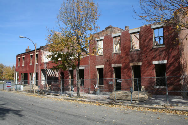 August 2003: Another solid run of houses marks the northeast end of the block, but several are in ruinous condition, beyond any hope of easy salvage.