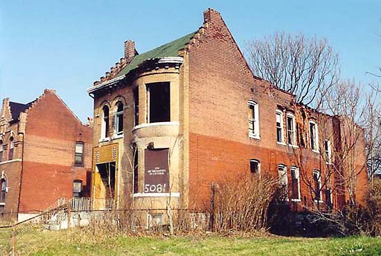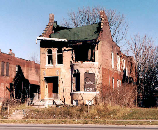 Bottom: 5081 Delmar, December 2002. The bay window has completely given out, taking the roof with it. The house was finally demolished in February 2003.