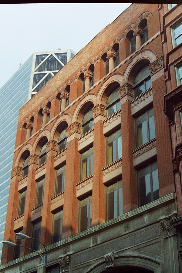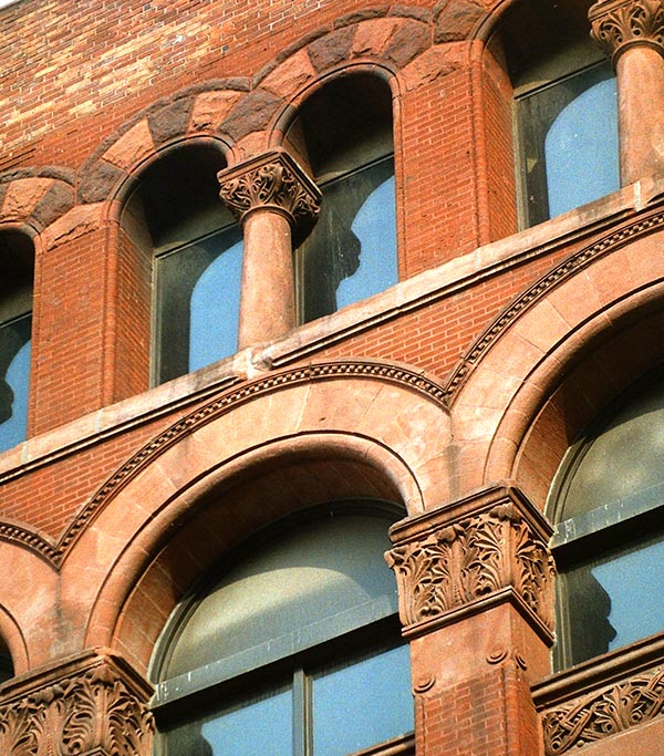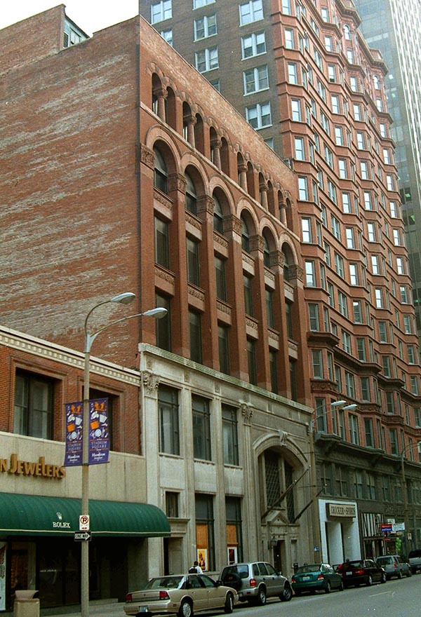 Stately Romanesque commercial building, with a later Renaissance revivalist facade at the street.
