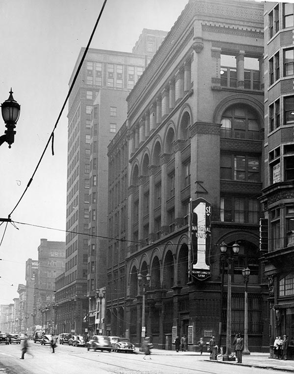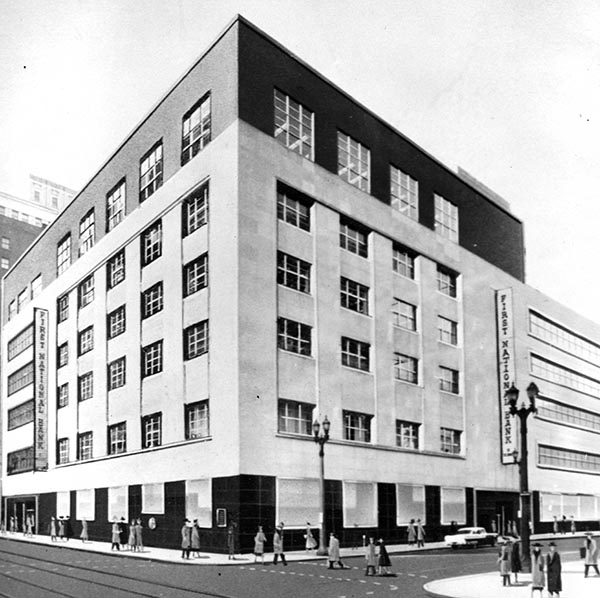 In 1955, First National Bank undertook a modernization of its building, replacing the Romanesque exterior with a Modernist facade with granite at the base, limestone panels above, and orange brick at the top. Much, if not all, of the original ornamentation was sawed off to provide a flatter surface for the new skin.
