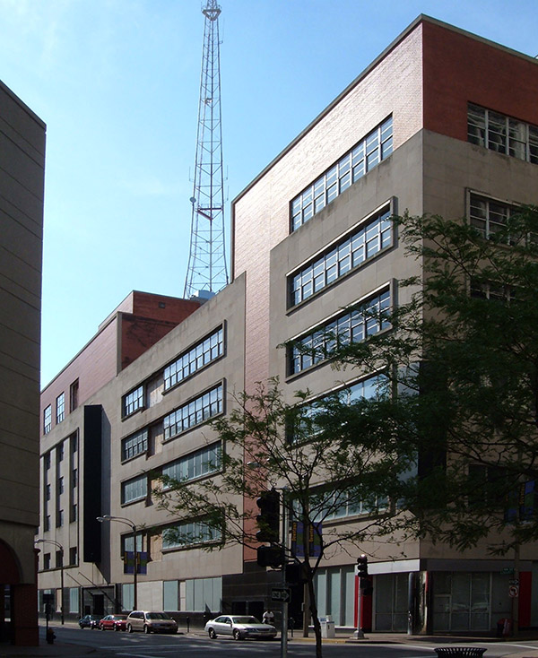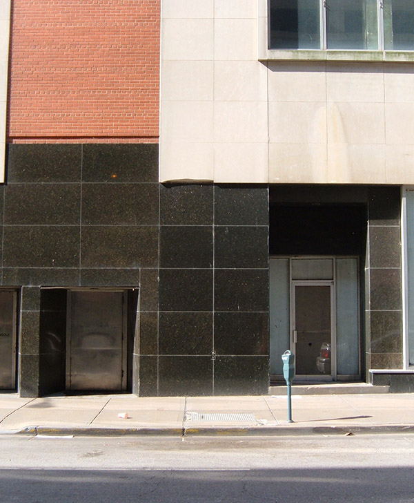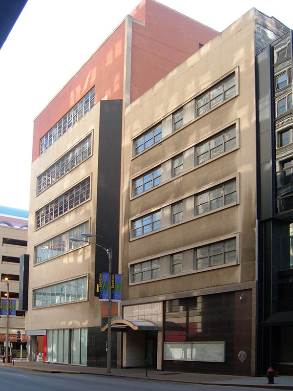 *Sources vary on how many buildings comprise the modern Mercantile Library Building. One blog says it's seven; another says it's two plus a 1950s addition; another says it's six (but they're including the old Paradowski Graphics building at 303 N. Broadway, covered by the same recladding but now a separate building.) The aerial view, meanwhile, shows five components, plus the old Paradowski space.