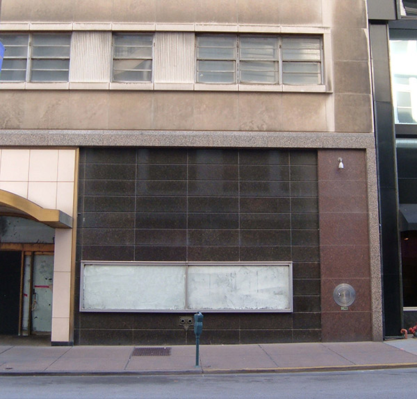 The desecration has begun in this early 1950s photograph of the building shortly before its modernization - note the sheared-off porch above the left-hand entryway and the scars along the street facade left from destroyed ornament. The building to the south (left edge of the photograph) has already been mostly reskinned. Globe-Democrat photograph, from the Missouri Digital Heritage collection; original image here.