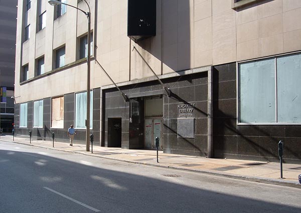 The Mercantile Library left downtown in 1998 for a new location on UMSL's campus in west County, taking the oranate interiors of its beautiful reading room with it. The Mercantile Library Building has sat empty ever since. It was stripped out at the end of the 1990s to become a "telecom hotel", a plan that was presumably wiped out by the Dotcom crash of 2000. Pyramid Development took the building on next, but nothing came of it before Pyramid folded in 2008. Most recently it has come into the hands of Spinnaker Real Estate Partners, developers of the MX project across the street.