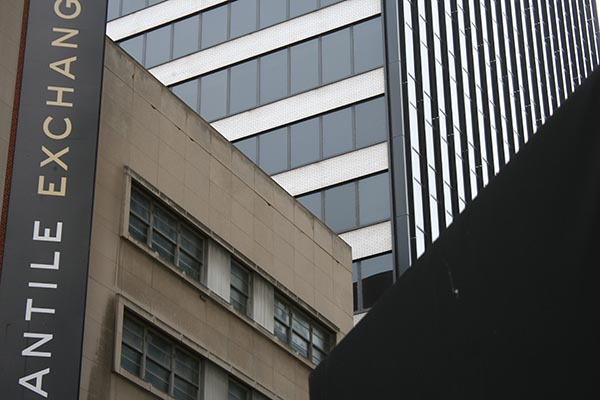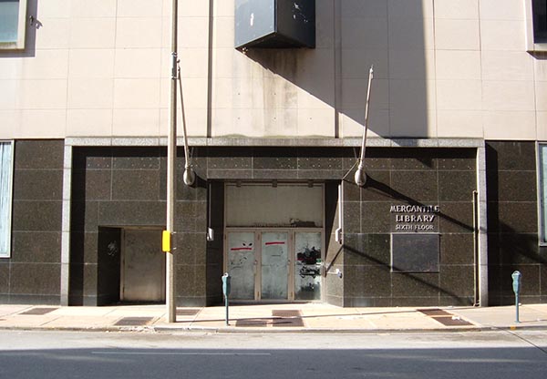 Behind the Modernist facade stand six* separate turn-of-the-century buildings, unified in the 1950s; the old Mercantile Library Building, at the southwest corner of Broadway and Locust, is the heart of the structure.