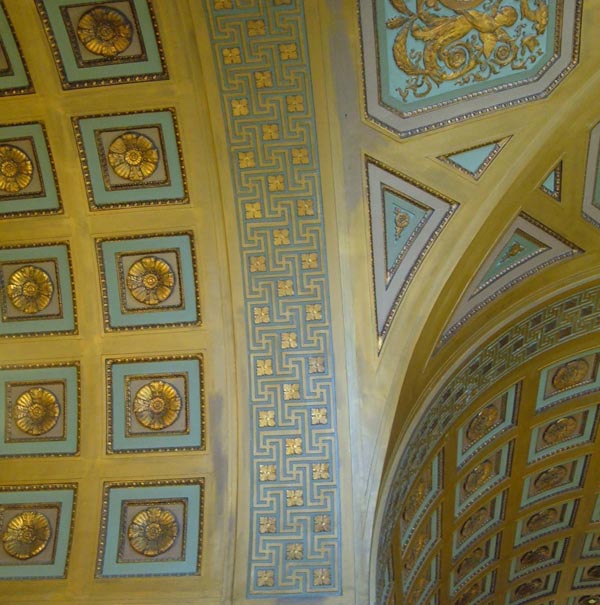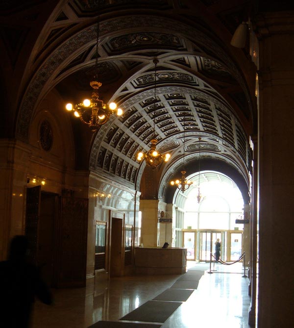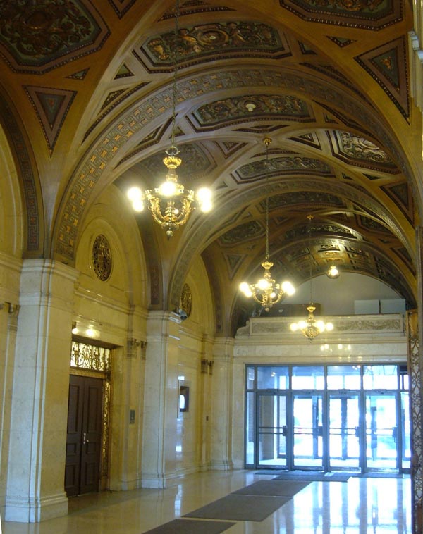 This elaborately massed Art Deco skyscraper is St. Louis's best example of a building stepped back at its upper heights to avoid throwing shadows on the surrounding streets. This sort of massing was modeled after a 1917 New York zoning ordinance.