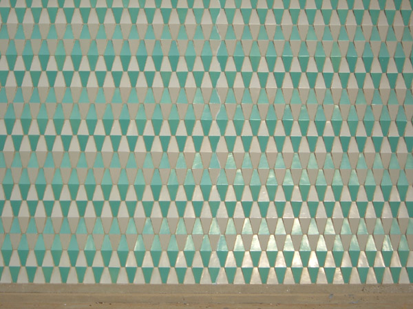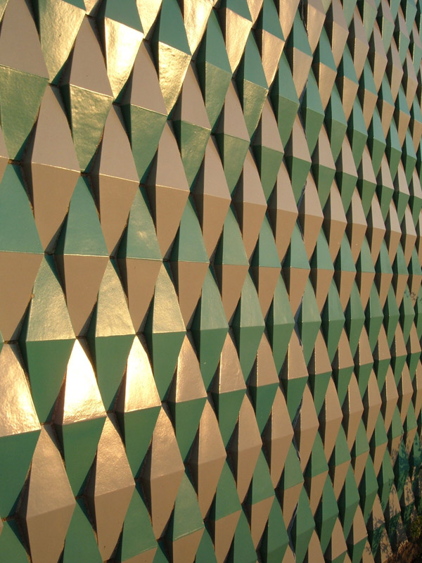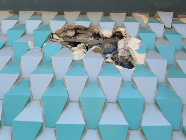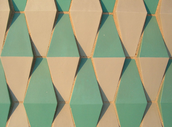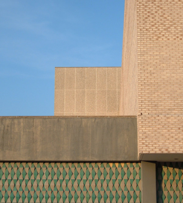 The sunken court on the south side is presided over by a looming massive wall of this glazed tile in a wonderful three-tone bowtie pattern unique to that side of the building, once proudly illuminated by a row of lights, themselves a spatial element in their neat file. The space is the epitome of 1960s elegance.