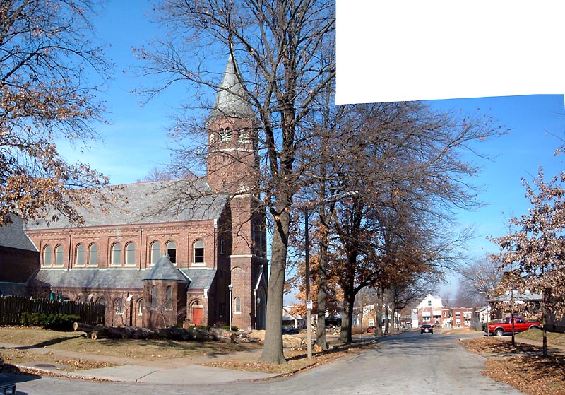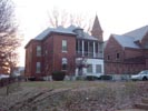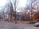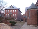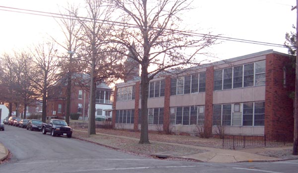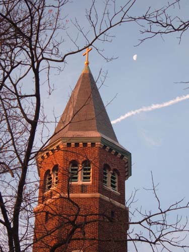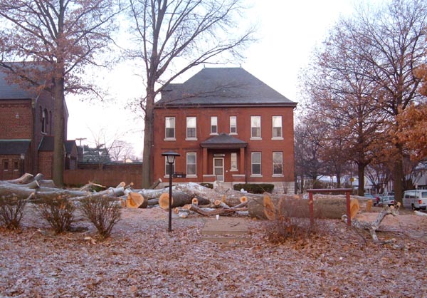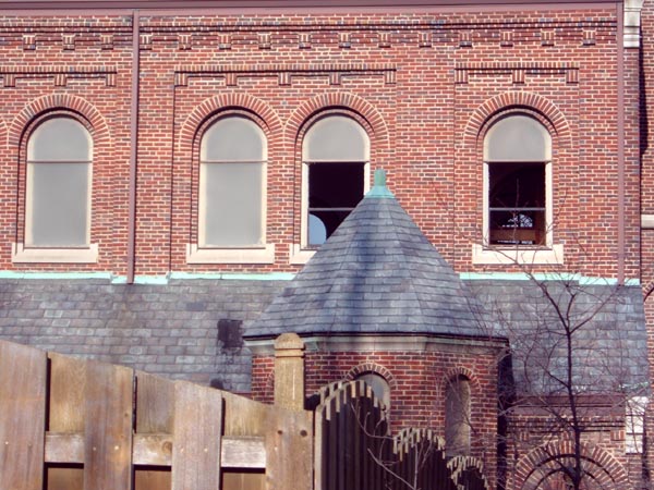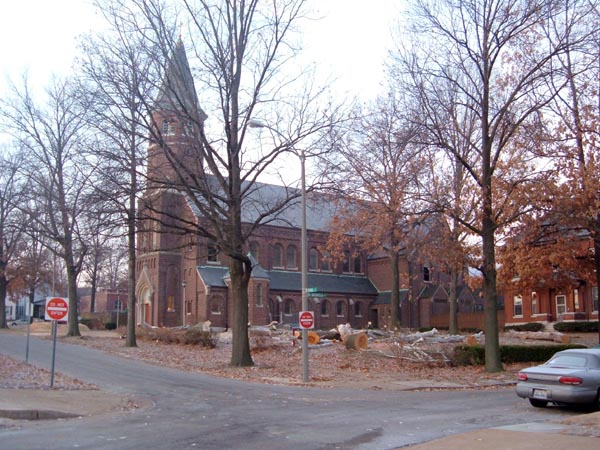 Unfortunately, this delightful urban ensemble is in danger. The archdiocese closed the parish, and has sold the buildings to developers who want to demolish the entire complex for new housing. Furthermore, underhanded efforts have been made to push this proposal through: input from the neighborhood has been effectively discouraged by treating the demolition as a foregone conclusion, and several attempts have been made to circumvent the city's preservation review ordinances. When I visited (Dec. 23, 2005), many old-growth trees on the site had already been cut down, a damaging blow to the neighborhood no matter the site's ultimate fate.