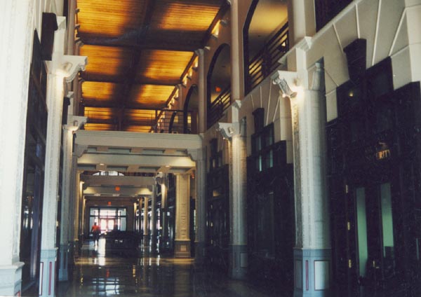 The buiding's airy interior atrium is the PostModern product of a 1985 remodeling by Mackey and Associates. The building held Webster University's downtown campus for many years until the University moved to new quarters in the Old Post Office. Today the Lammert contains the AIA bookstore as well as the office and display space of Landmarks Association of St. Louis.